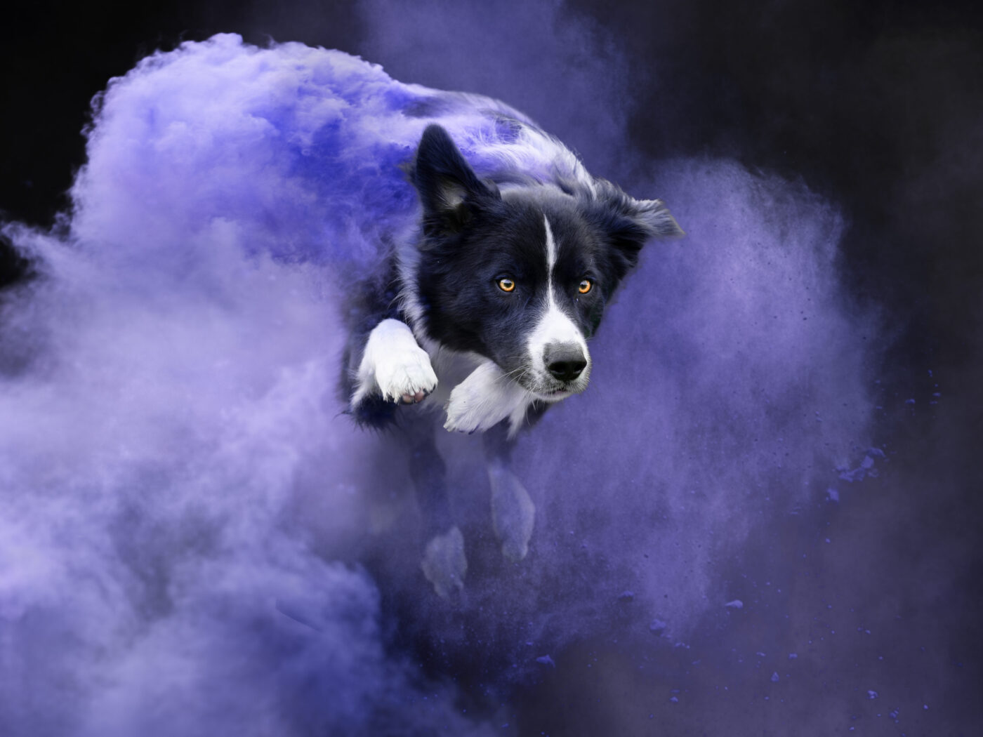 Een sprong richting de camera is een heel krachtig beeld omdat je de hond recht in de ogen kijkt. Op deze foto’s zie je enkel de hond zijn gezichtsuitdrukking, en het poeder. De gezichtsuitdrukking is wat deze foto’s zo bijzonder maakt. Sommige honden stralen enorm veel plezier uit, anderen juist concentratie en werklust. Beide zijn ontzettend mooi en maken een beeld wat vaak een bepaalde interactie aan gaat met het publiek. Deze foto’s zijn uitdagend om te maken en voor de meeste fotografen lastig om precies goed te krijgen. Dit is omdat de beweging recht op de camera af komt, en de timing nog crucialer is dan bij een zijwaartse sprong. Gelukkig is actie richting de camera voor mij geen probleem en mag je een ragscherpe en goed getimede foto verwachten.